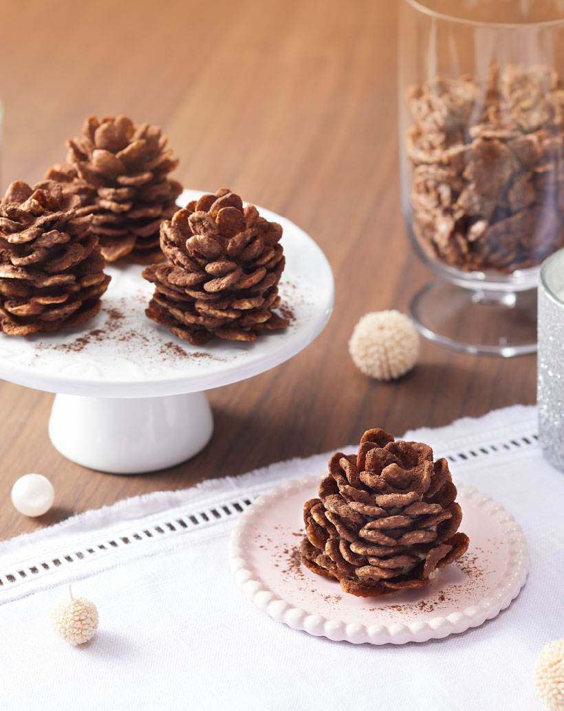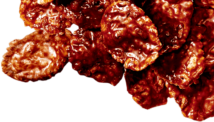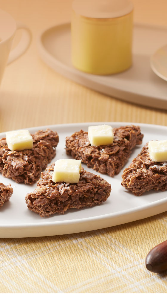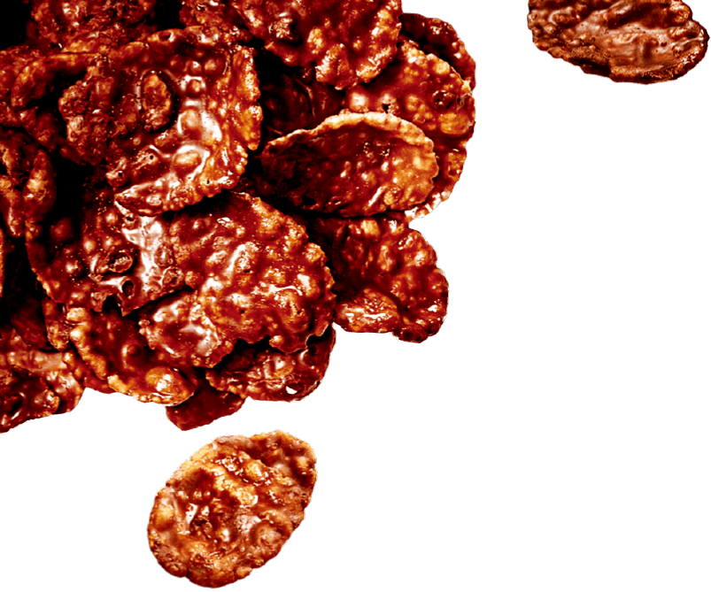 ヘーゼルナッツペーストを使用したジャンドゥーヤ仕立てのチョコレートで、薄焼きコーンフレークとローストしたクラッシュアーモンドを円盤状に固めました。