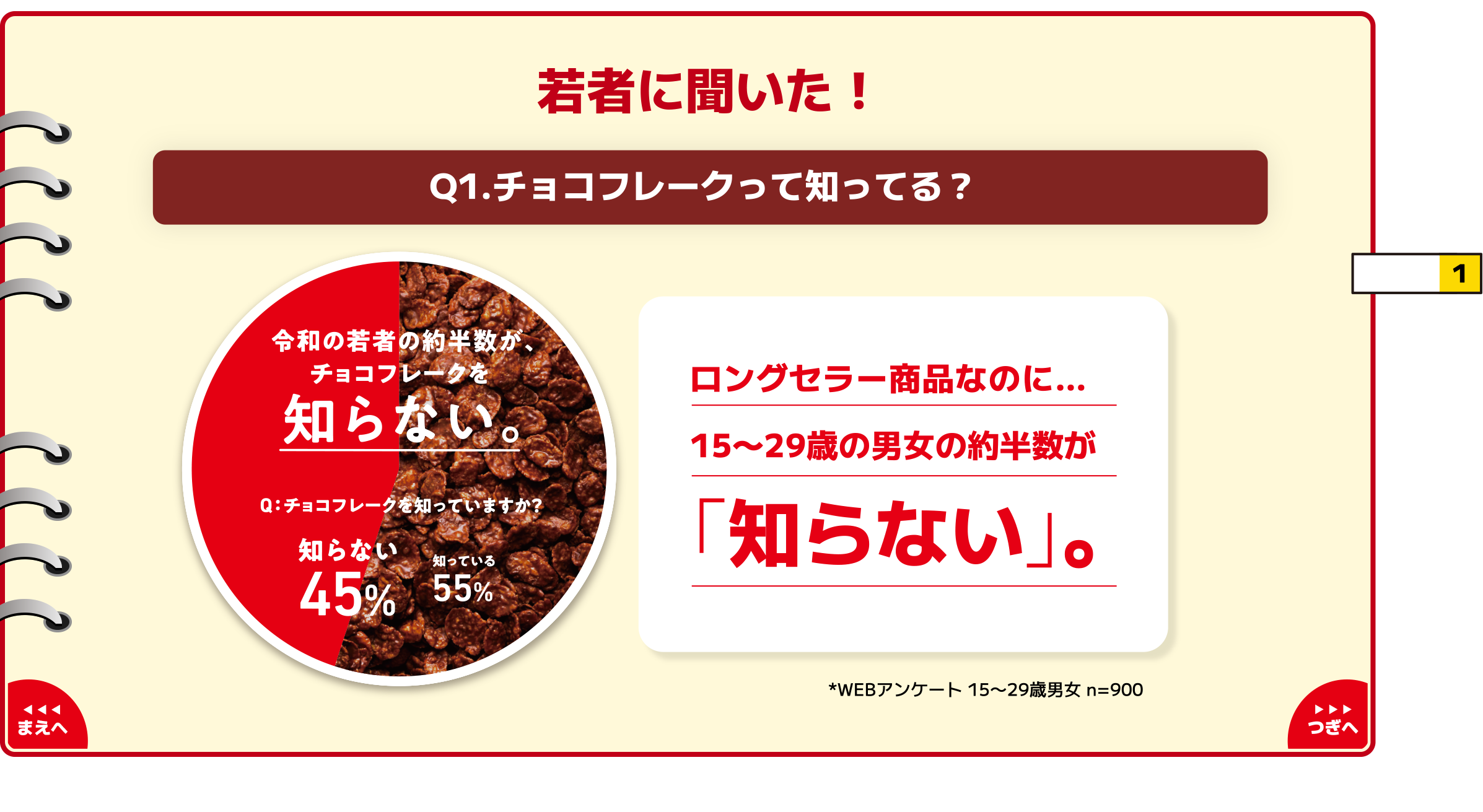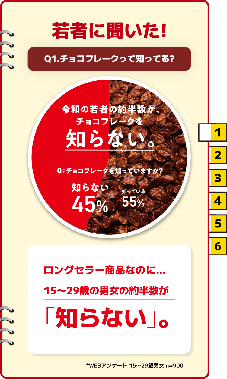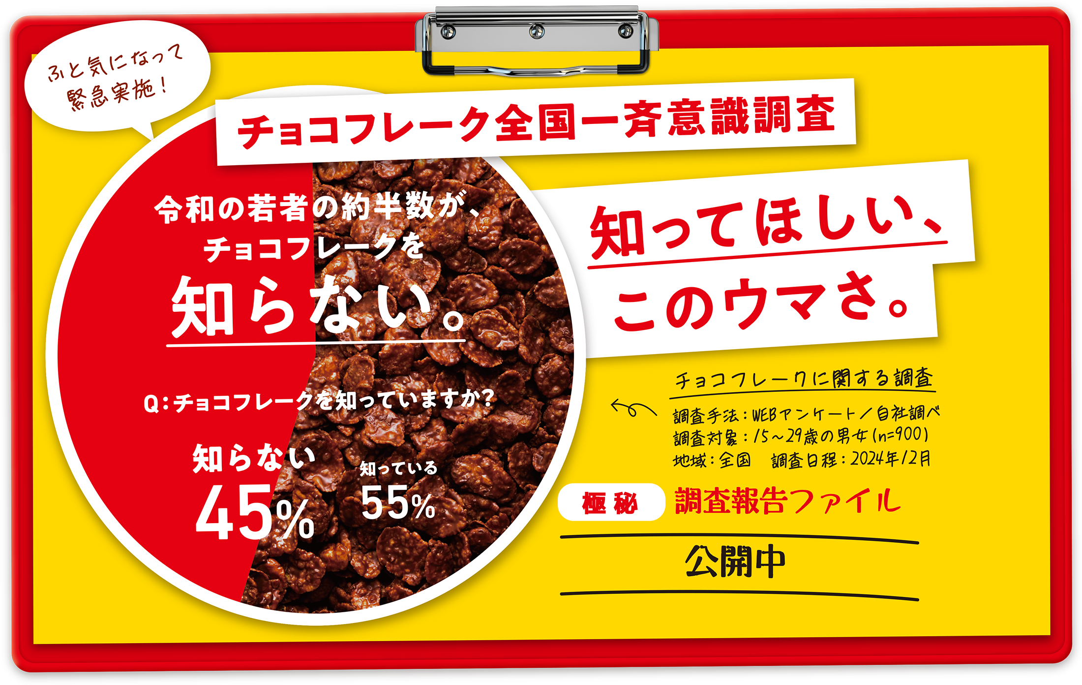 チョコフレークは1968年発売のロングセラー商品。コーンフレークのザクザク食感とチョコレートのおいしさで、長い間、親しまれてきました。